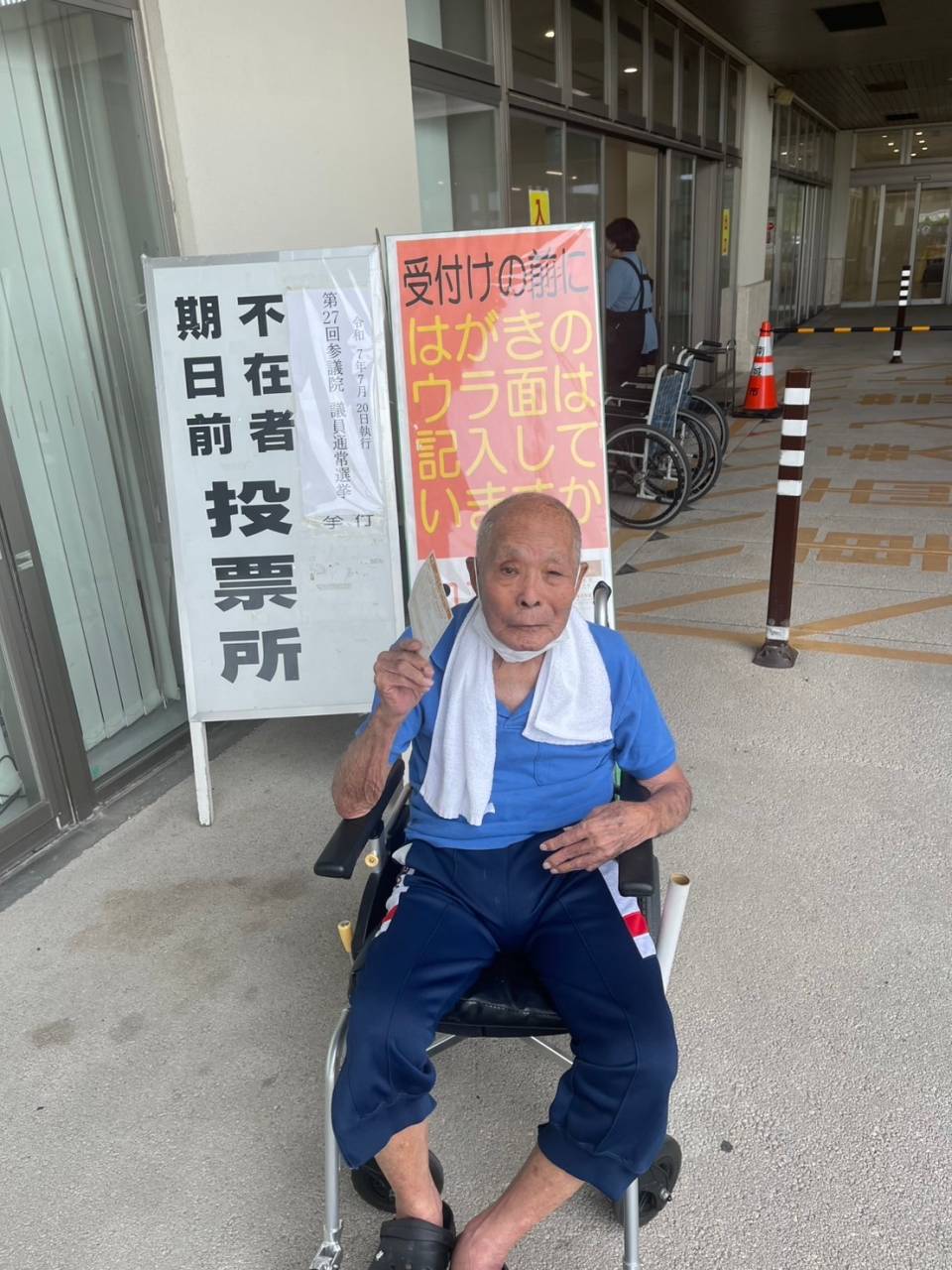 投票を終えたご利用者様の表情はとても晴れやかで、「外の空気を吸えて気持ちよかった」「南城市役所はとっても広いね」「今年も選挙に行けてよかった」という言葉も聞かれ、