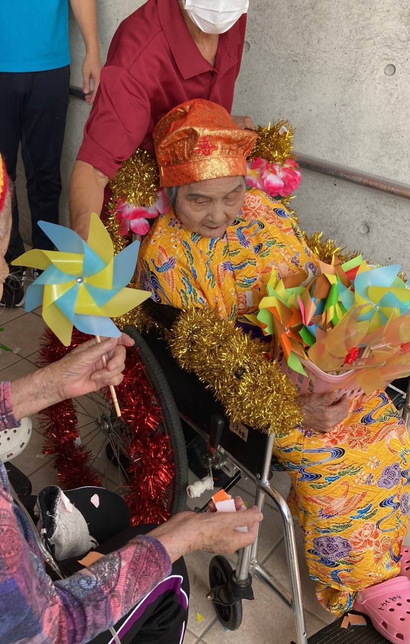 笑顔溢れるカジマヤーのお祝い 2025/10/27 笑顔溢れるカジマヤーのお祝い 2025年10月 10月のあいさつ 朝晩の風がだんだんと涼しくなり、秋の深まりを感じる季節となりました。 日中はまだ暖かい日もありますが、季節の変わり目は体調を崩しやすい時期でもあります。 皆さまには引き続き水分補給と体温調整に気をつけて、元気にお過ごしいただきたいと思います。 来月は少しずつ冬支度の準備も始まります。寒暖差が大きくなりますので、 皆さまどうぞお体にお気をつけください。 笑顔溢れるカジマヤーのお祝い 利用者さまのカジマヤーをお祝いいたしました。 沖縄では、カジマヤーは97歳の長寿を祝う特別な行事で、「再び童心に返る」と言われるおめでたい節目です。 色鮮やかな琉装に身を包まれたご本人は、とても華やかで笑顔が輝いておられました。 当日は、職員手作りの飾りつけや風車に囲まれ、まるでお祭りのような雰囲気に包まれました。 風車を手に取って喜ばれる姿や、「ありがとう」「うれしいね」と話される言葉に、会場は一層あたたかな空気に包まれました。 「祝カジマヤー」の文字が掲げられ、ご利用者さまや職員みんなが温かい拍手と笑顔でお祝いしました。 長い人生の中で多くの経験を積まれ、いまも元気に笑顔で過ごされている姿に、私たち職員もたくさんの元気をいただきました。 これからもお元気で、笑顔いっぱいの毎日を送っていただけるよう、職員一同サポートしてまいります。 カジマヤー、本当におめでとうございます!これからも末永くお健やかにお過ごしください。 利用者様ご家族様や地域の皆様へ こちらのホームページのブログでは、 住宅型有料老人ホーム「TRFこころ」での 様子や活動を定期的に更新して行きます。 利用者様が楽しんで生活されている様子を情報発信していけたらと思っております。 また、介護への悩みや、入居希望、就職希望の方は、ご気楽連絡お待ちしております。 今後とも、弊社、TRFハート合同会社を、よろしくお願いします。 TRFハート合同会社 ヘルパーステーションTRFはーと 有料老人ホームTRFこころ 広報担当 簱