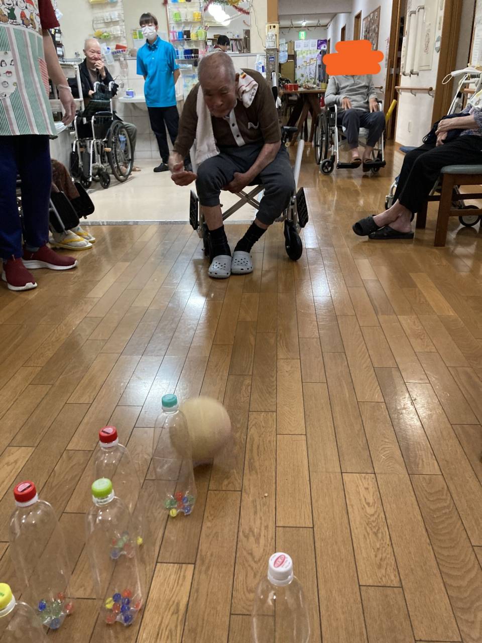 今回の主役は、ボーリングを趣味として楽しまれていた方です。昔の思い出を少しでも感じていただけたらという思いから、職員でアイデアを出し合い、ペットボトルを使った「手作りボーリング大会」を開催しました。